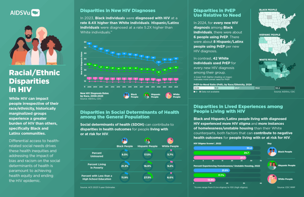 - Racial disparities endured in 2023: Black individuals represented 39% of those living with HIV, despite comprising just 12% of the U.S. population. The HIV prevalence rate for Black individuals (1,245 people with HIV per 100,000 population) was 7× higher than that for White individuals (180 per 100,000).