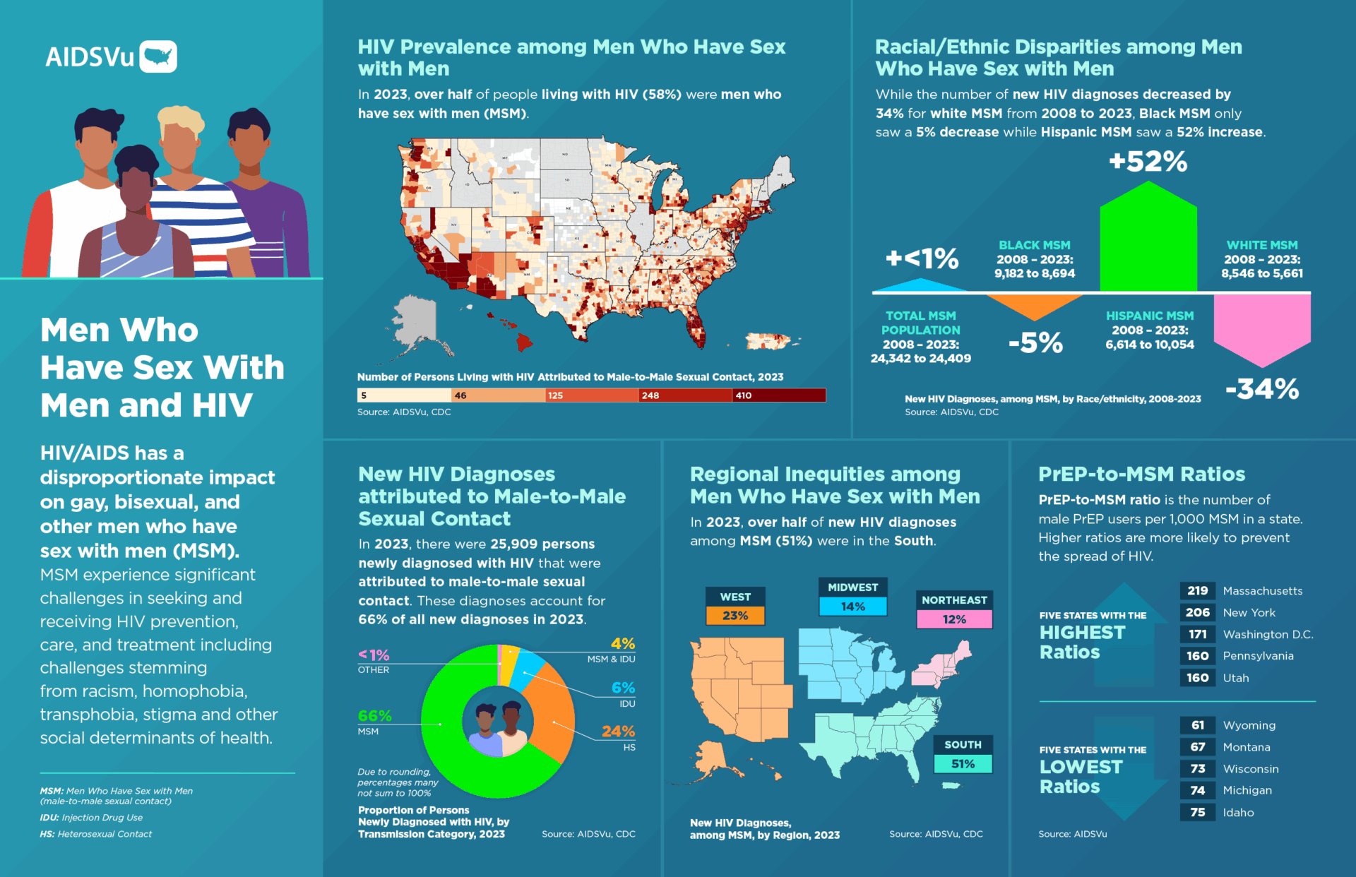 AIDSVu’s infographics encourage new ways of visualizing the HIV epidemic among the gay, bisexual, and MSM communities. Share them on social, print them out as one-pagers, and add them to your presentations.