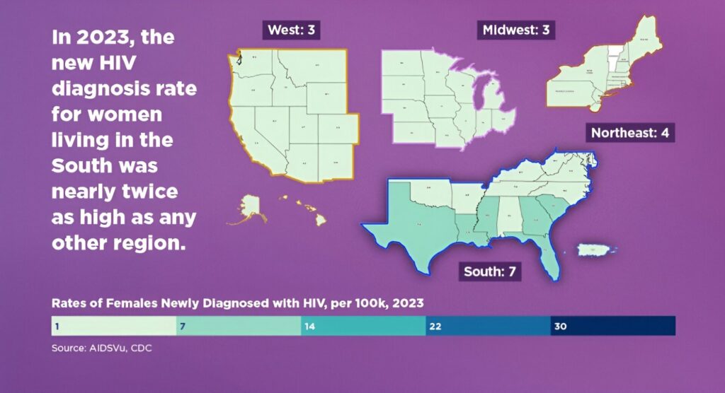 In 2023, Black women represented nearly half of new HIV diagnoses among women, despite accounting for only 13% of the U.S. female population. New diagnosis rates among women in the South were also nearly twice as high as in other U.S. regions.